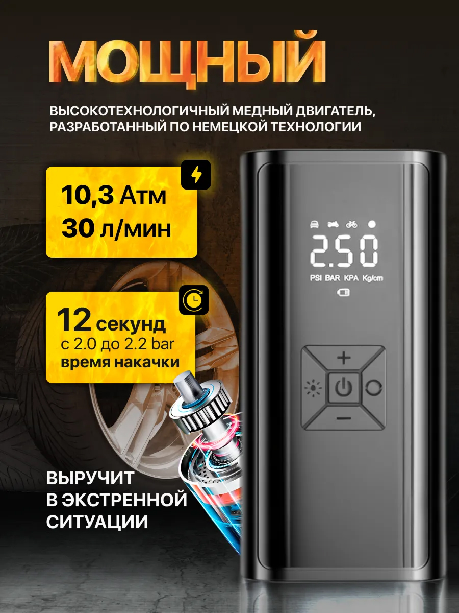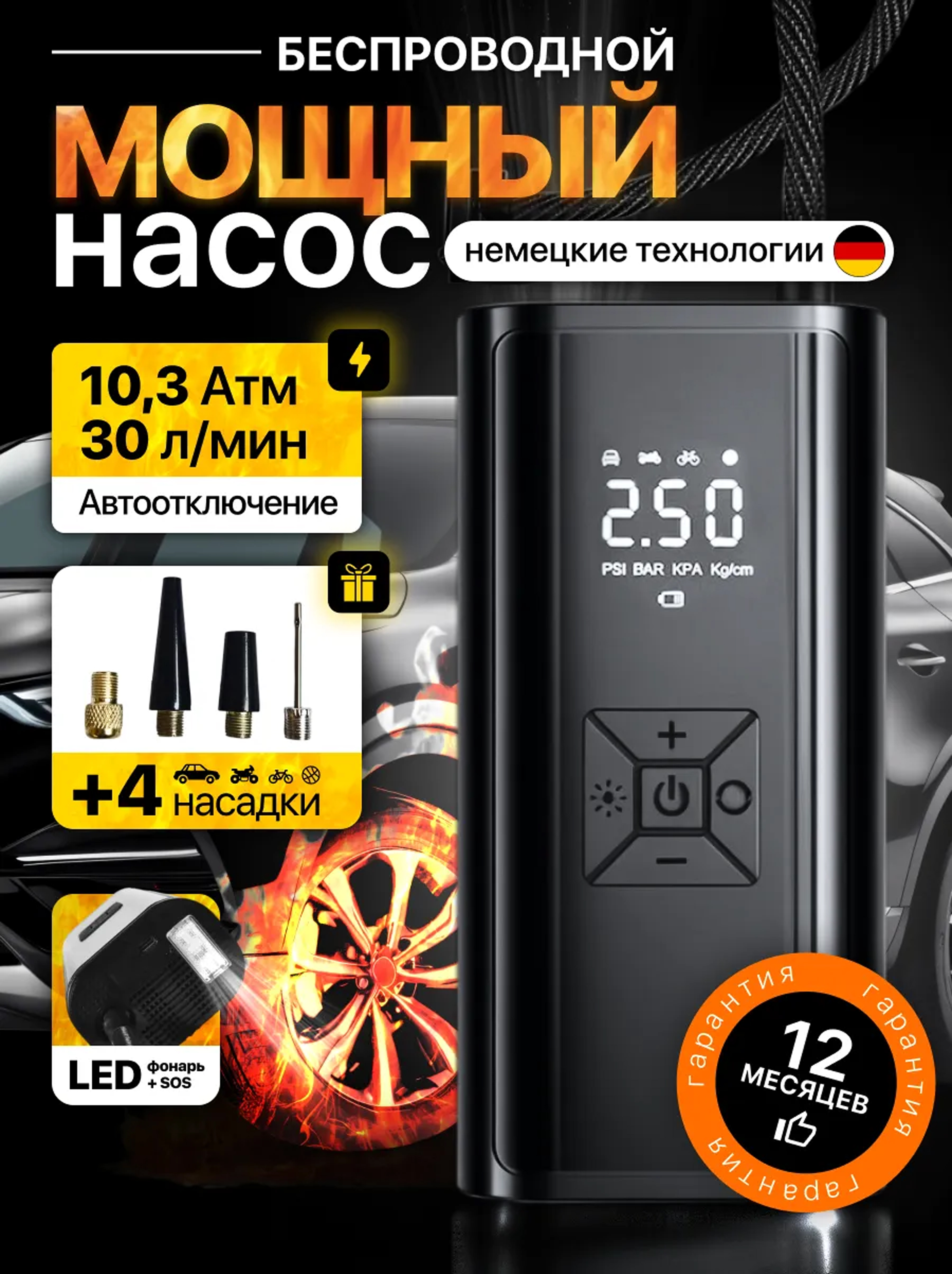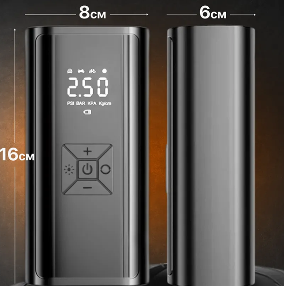 Беспроводной автомобильный компрессор — ваш незаменимый помощник в дороге и дома. С ним вы легко накачаете шины автомобиля, велосипеда, мотоцикла, а также надувные матрасы, лодки и даже мячи. Больше не нужно искать розетку или возиться с проводами — мощный аккумулятор и автономная работа обеспечивают свободу действий в любом месте.