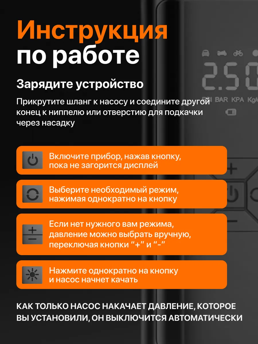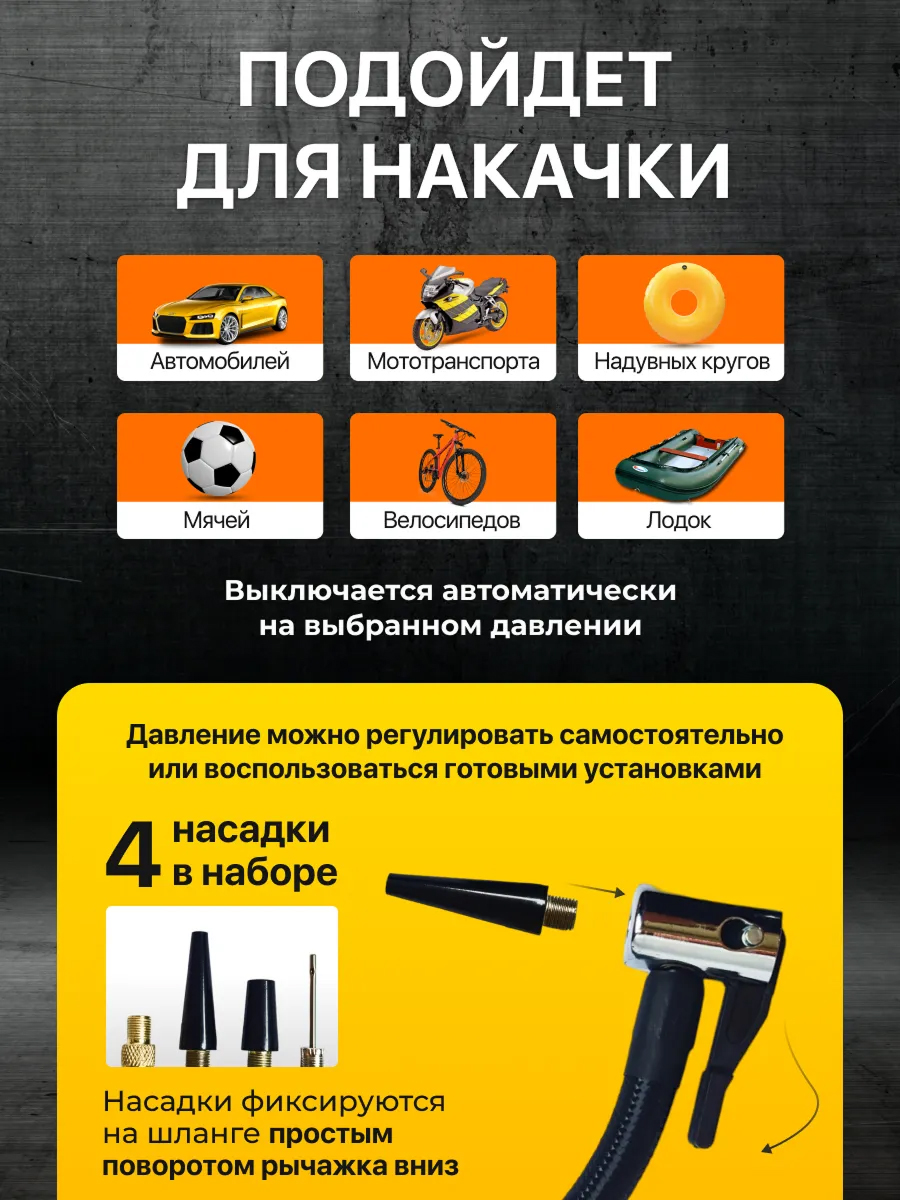 Компрессор оснащён цифровым манометром с LED-экраном и функцией автоматического отключения при достижении нужного давления. Встроенный фонарик с режимом SOS поможет в экстренной ситуации, а 4 универсальные насадки делают его идеальным для любых задач. Лёгкий и компактный, он поместится даже в небольшом бардачке.